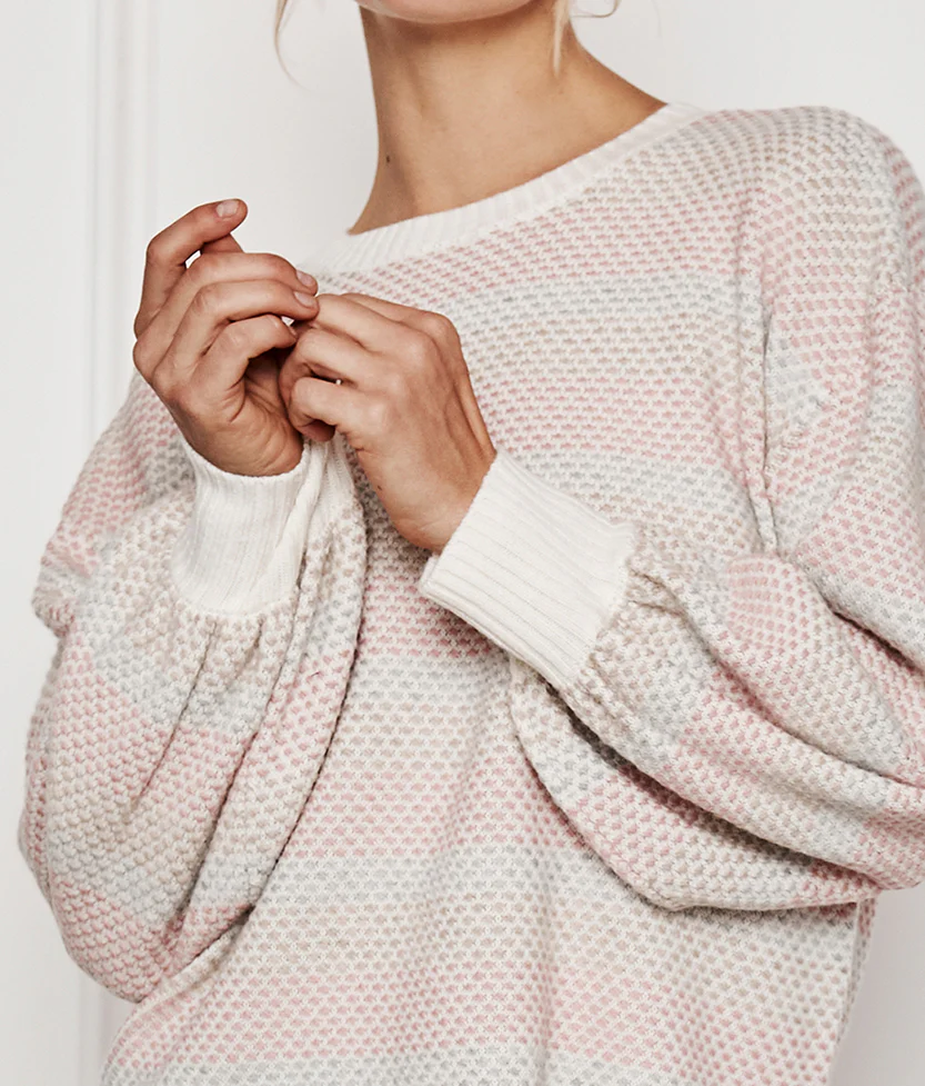 Meet your new go-to for cold-weather fun. Knit from our fan-favorite cashmere blend, this pullover sweater features a relaxed fit, dramatic balloon sleeves, & striped design for an easy — and cozy — statement.