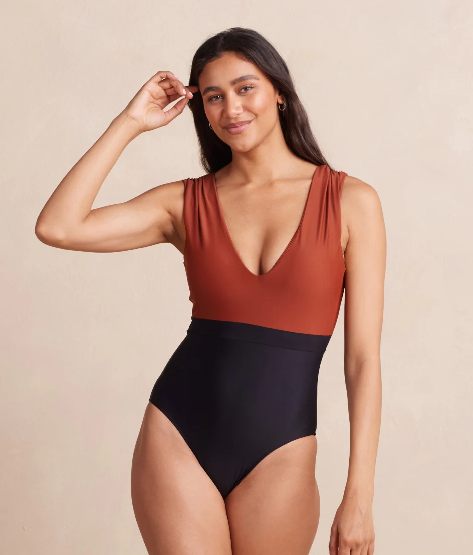 A deep vee front, a stunning open back, and a ruched touch —this suit has it all. Our signature compression keeps you feeling secure (no tugging or adjusting), and the architectural details make a statement from every angle. This suit includes flattering wide shoulders, soft gathering at the shoulders, and a flattering (and compressing) seaming at the waist and back. Get out there and get ready to turn some heads.