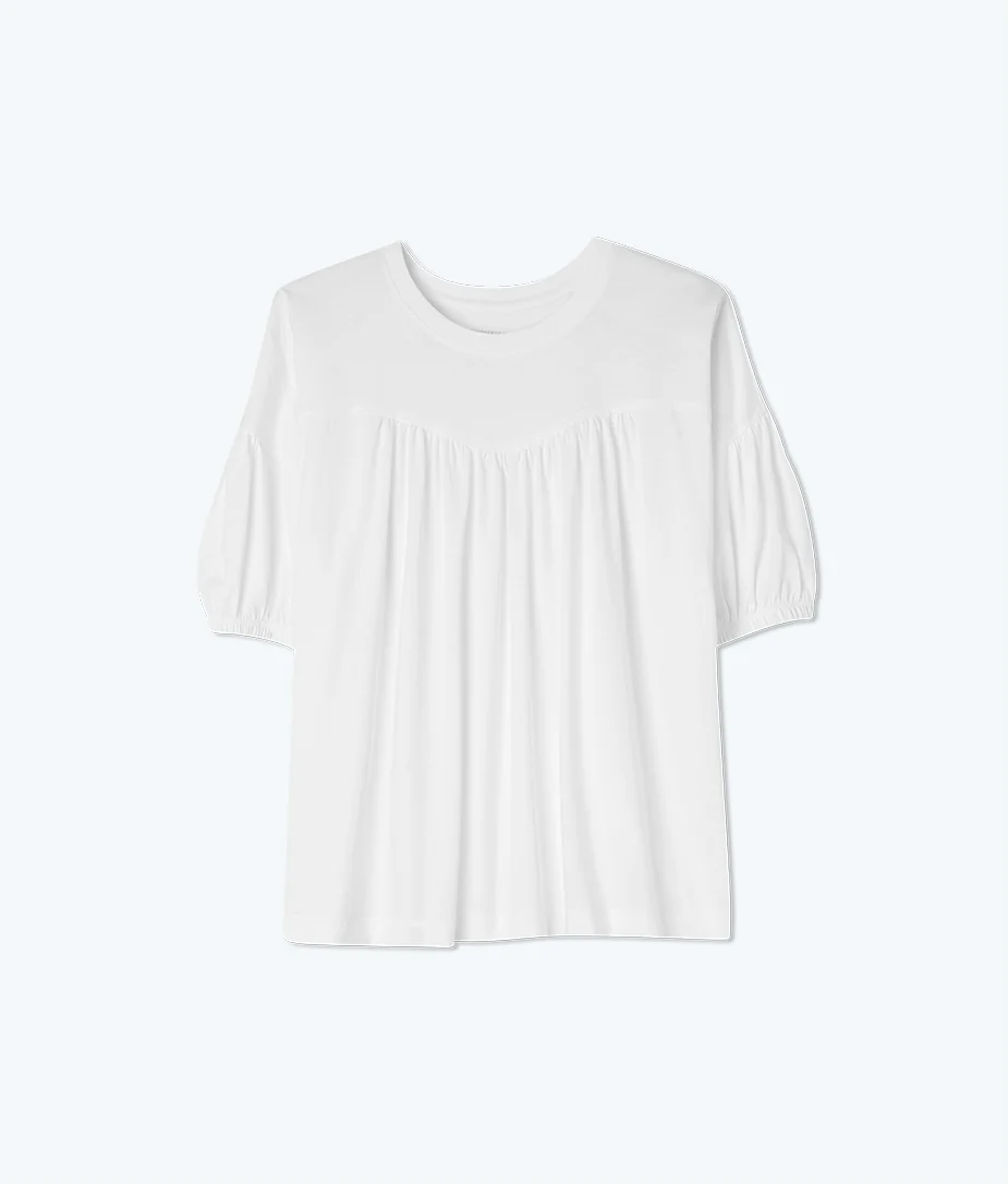 The perfect tee for people who don’t do tees. Crafted from premium Peruvian Pima cotton, this new essential makes an elevated (yet easy) statement with shirring & puffed sleeves. Soft and lightweight, it looks equally chic tucked or untucked.