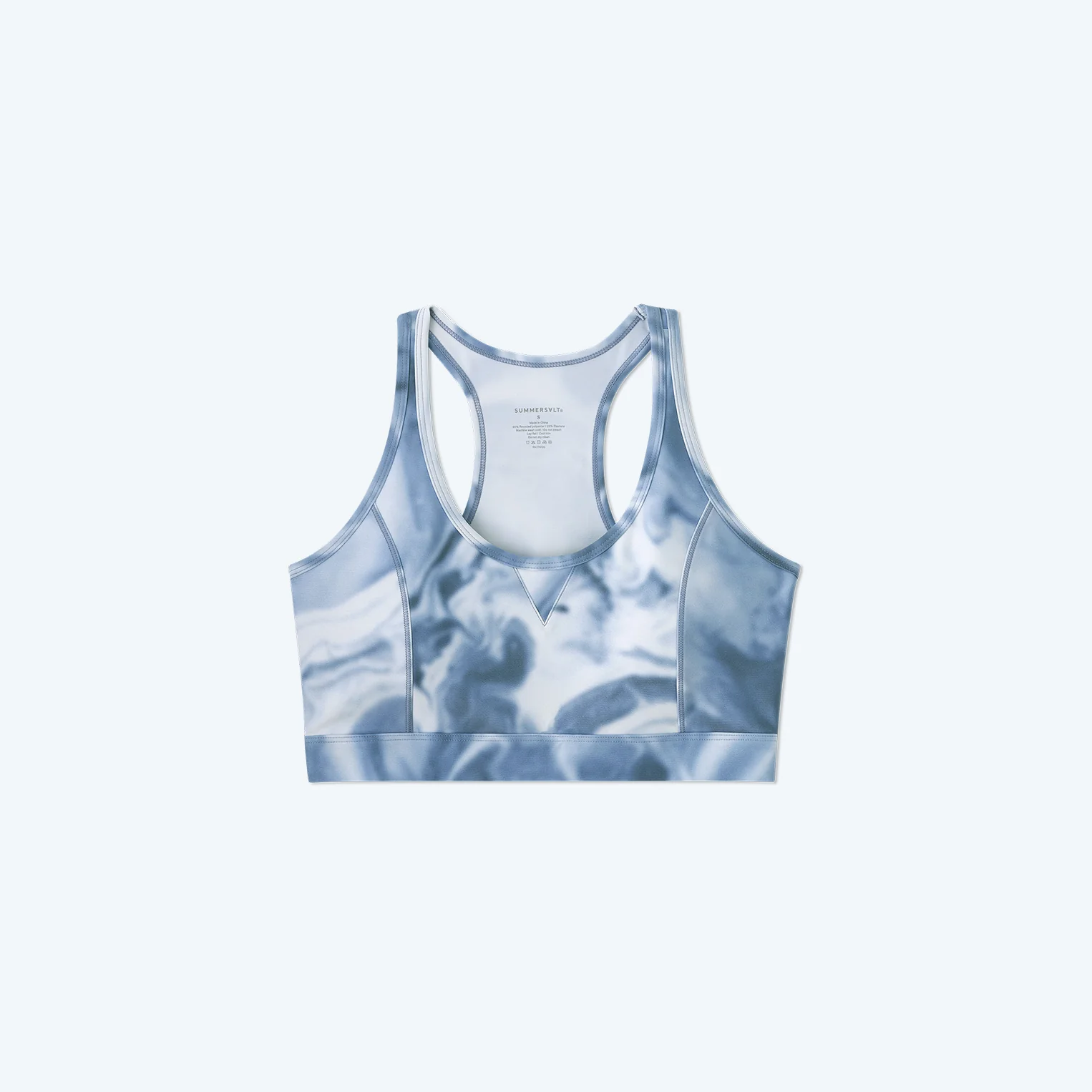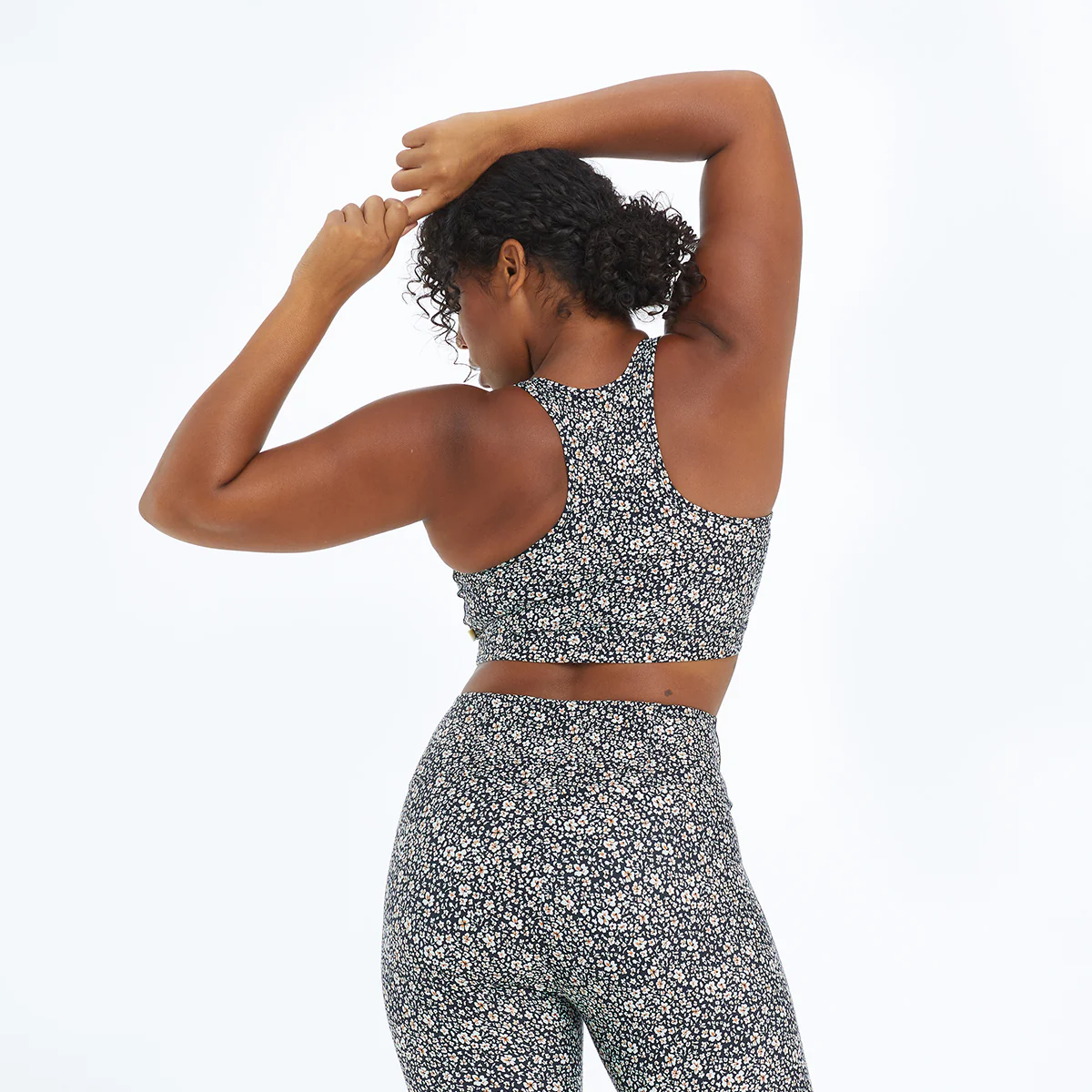 Move with ease and comfort in this soft, moisture-wicking sports bra, which features a convenient back pocket that can hold your phone or credit cards. Built with materials made from recycled plastic bottles, this bra is supportive, stylish, and sustainable. Talk about a win-win-win.