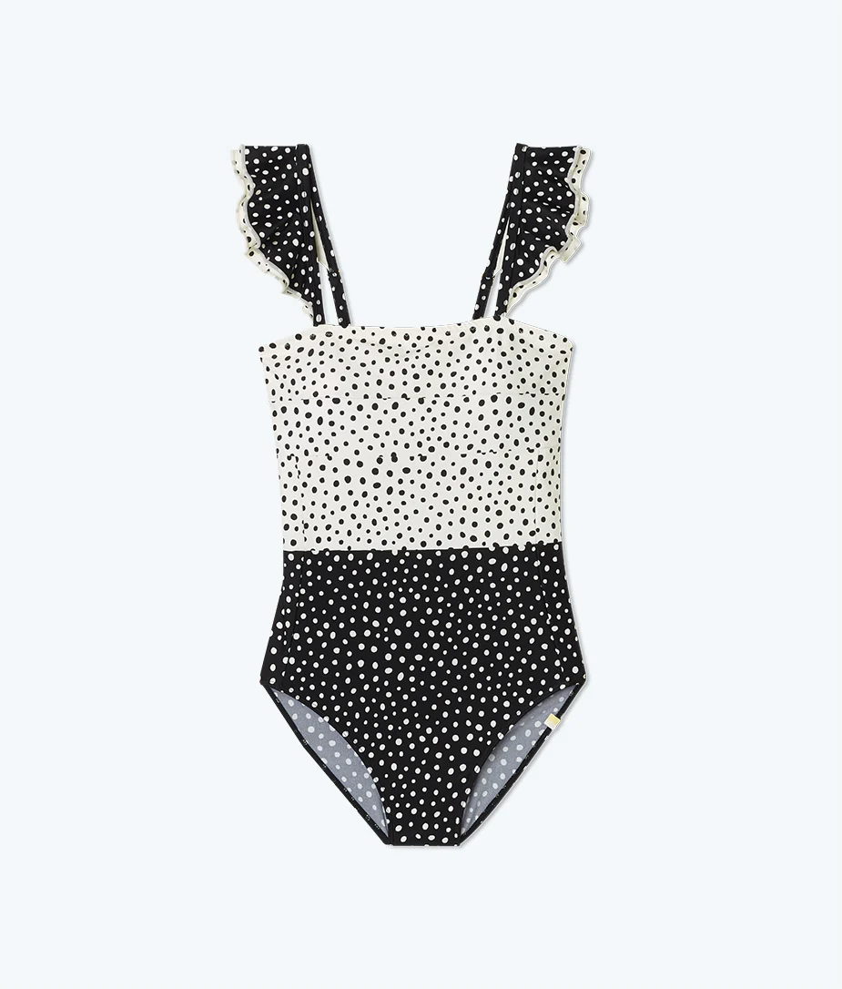 This classic maillot gets a chic update with mixed prints and a wink of ruffles. Built-in soft cups provide support and coverage and the colorblocking at the natural waist flatters every figure.