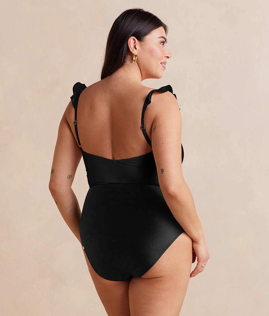 This classic maillot gets a chic update with mixed prints and a wink of ruffles. Built-in soft cups provide support and coverage and the colorblocking at the natural waist flatters every figure.