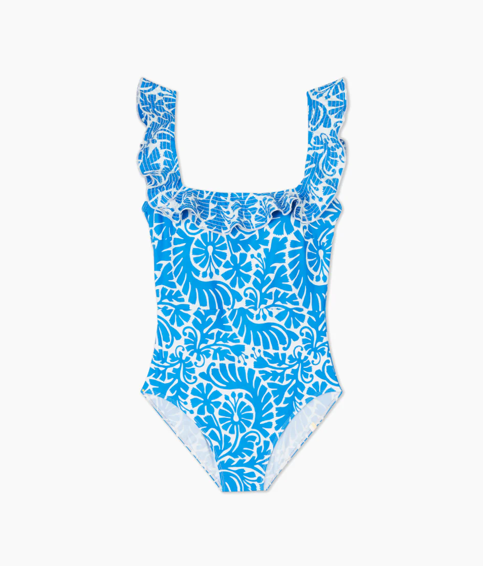 The Ruffle Seaway Square Neck One-Piece – Floral Wave in Azure