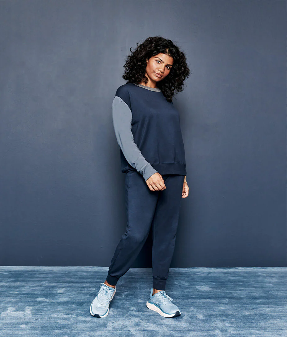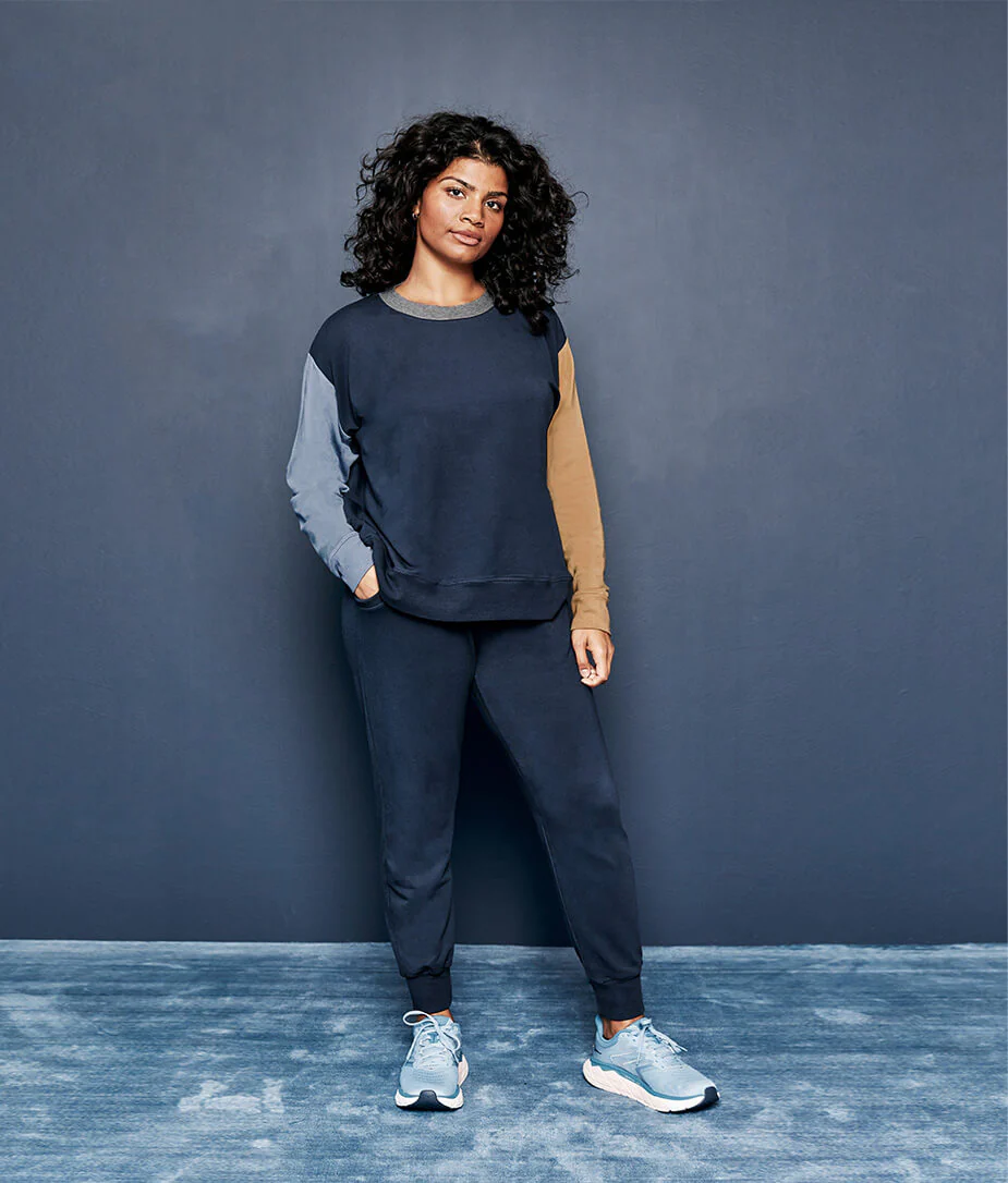 Imagine your best, worn-in t-shirt had a love child with a cozy blanket. That’s the next-level comfort of our soft & eco-friendly French Terry fabric. With a relaxed fit and eye-catching colorblocking, this cozy crewneck is destined to be your go-to pullover. Pair it with its bestie, The Softest French Terry Jogger, for the perfect set.