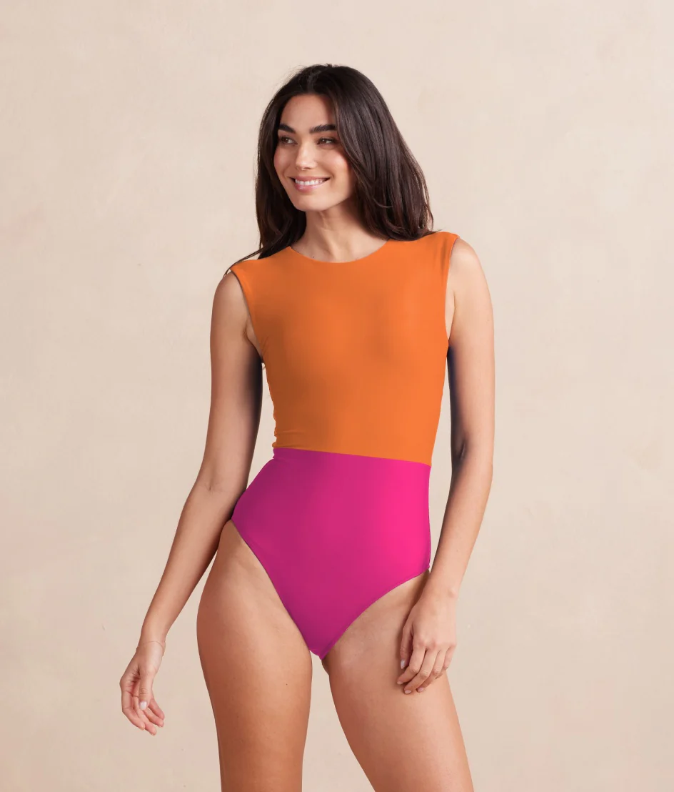 High-neck meets high fashion in this full-coverage, colorblocked beauty.